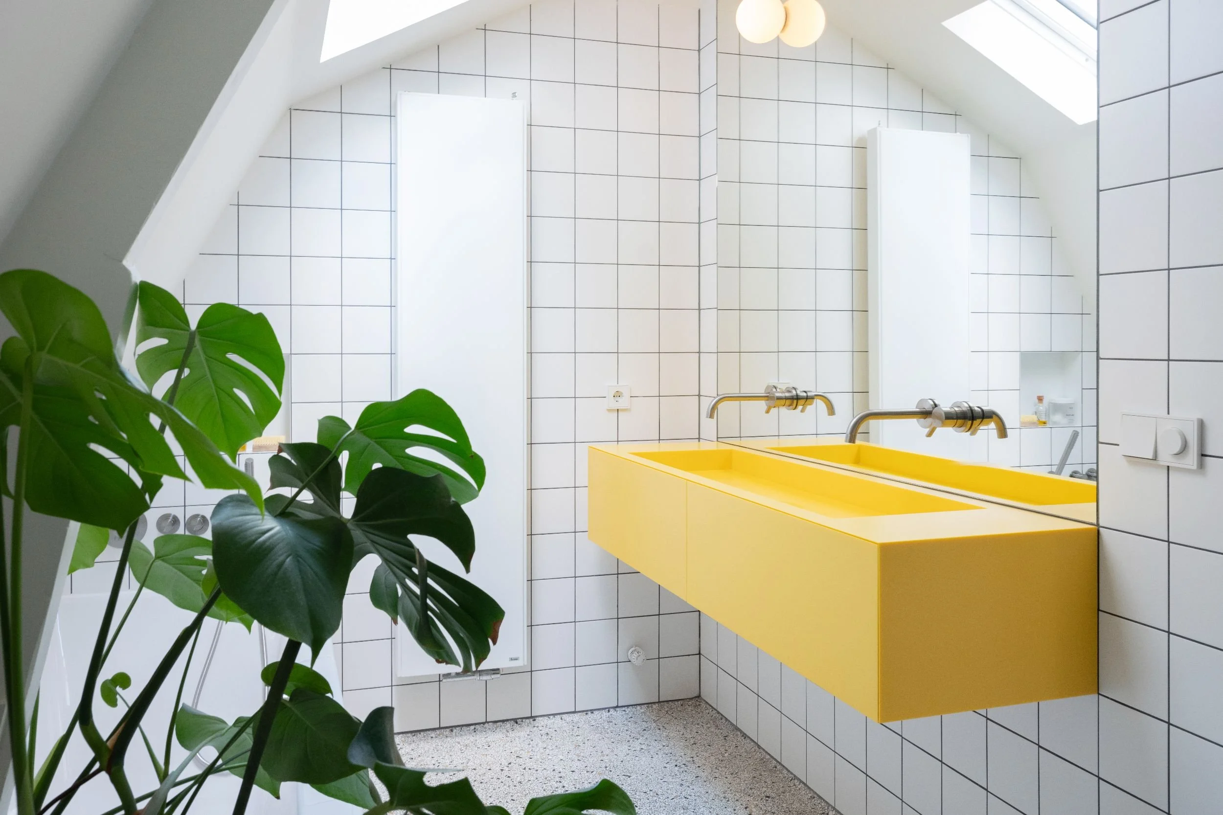 This Banana yellow Himacs basin with 45 degree edges appears as a solid block but host two drawers. The measurements are based on the sum of the tiles creating a continuous grout all around. The basin is complemented with a custom made mirror with integrated faucets